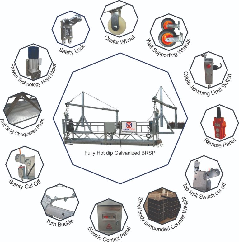 Hoists, Safety locks, Electric Control System, Suspend platform, Suspension Mechanism, Counter Weight & Steel Ropes etc.
